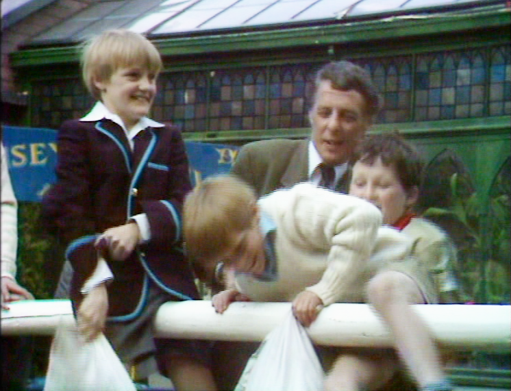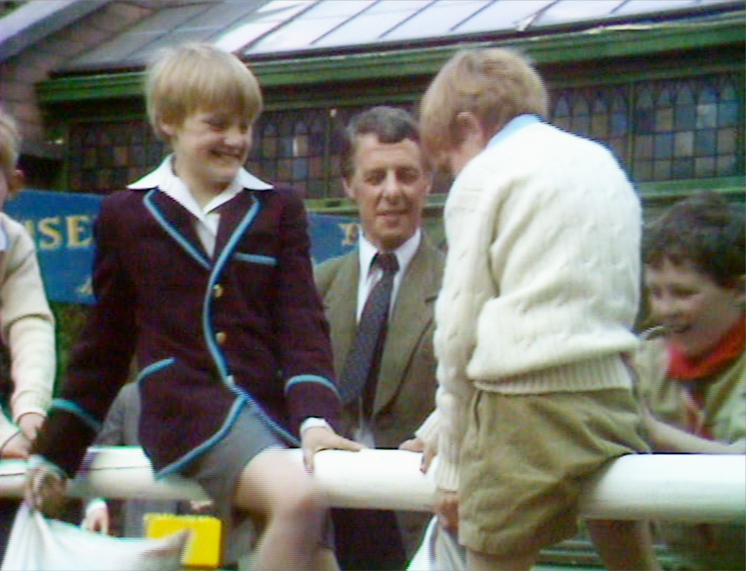 Colin's cousin is holding a pillow and facing the camera. That boy's opponent, with his back to the camera and wearing an irish Aran sweater, is Colin himself. Visible standing near him are Helen Hughes (Georgine Anderson) and Edwin Ashton (Colin Douglas). In the second photo, you get a glimpse of young Colin Harrison's face.