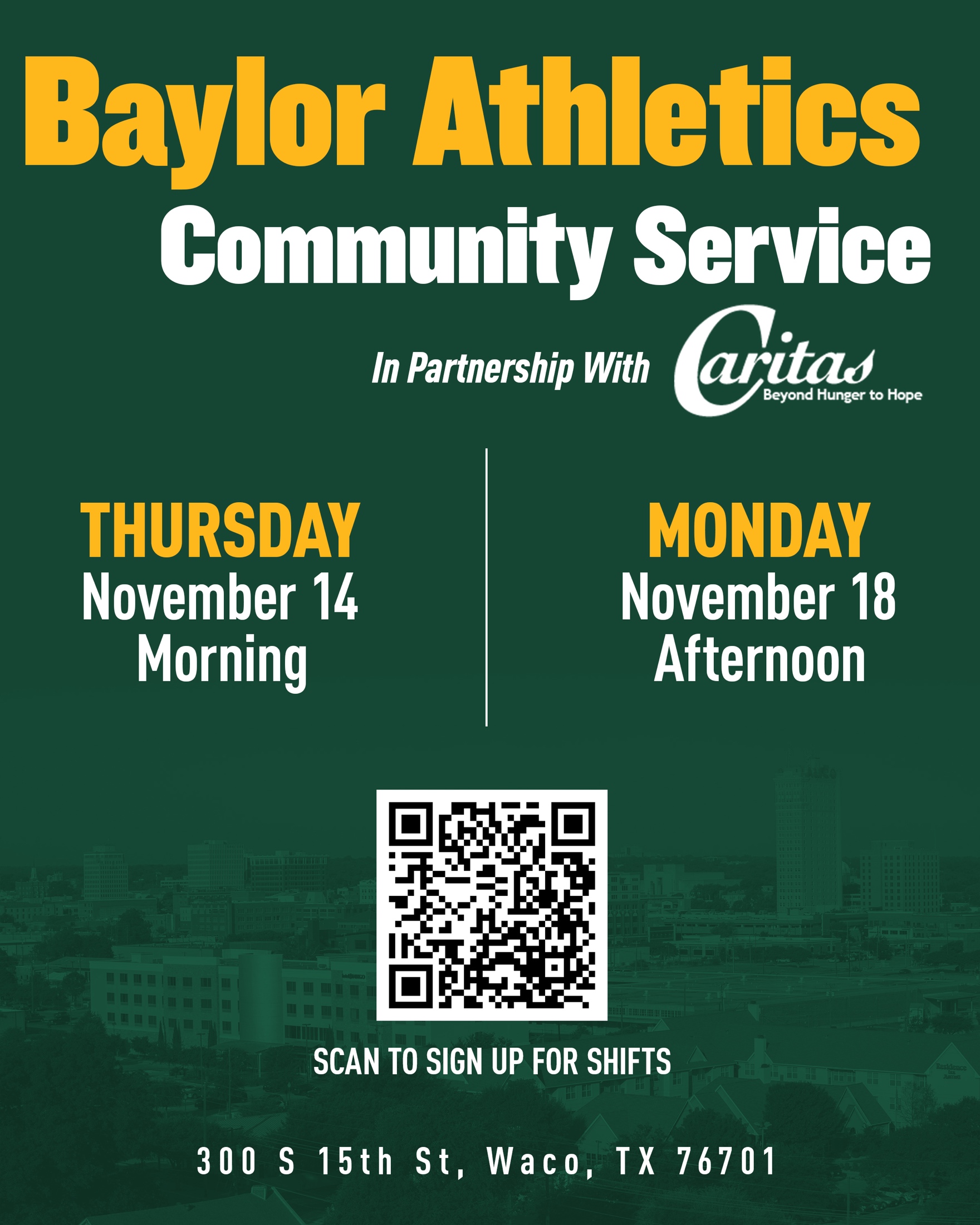 There’s still time to sign up for volunteer shifts with Caritas THIS THURSDAY, Nov. 14 or next Monday, Nov. 18. Also, we just received news that Thursday is the first day of Caritas’ Turkey Giveaway, and we’d love to have as much Baylor Athletics representation as possible.
