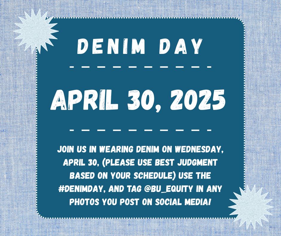 Join us in wearing denim on Wednesday, April 30, (please use best judgment based on your schedule), use the #DenimDay, and tag @BU_Equity in any photos you post on social media!