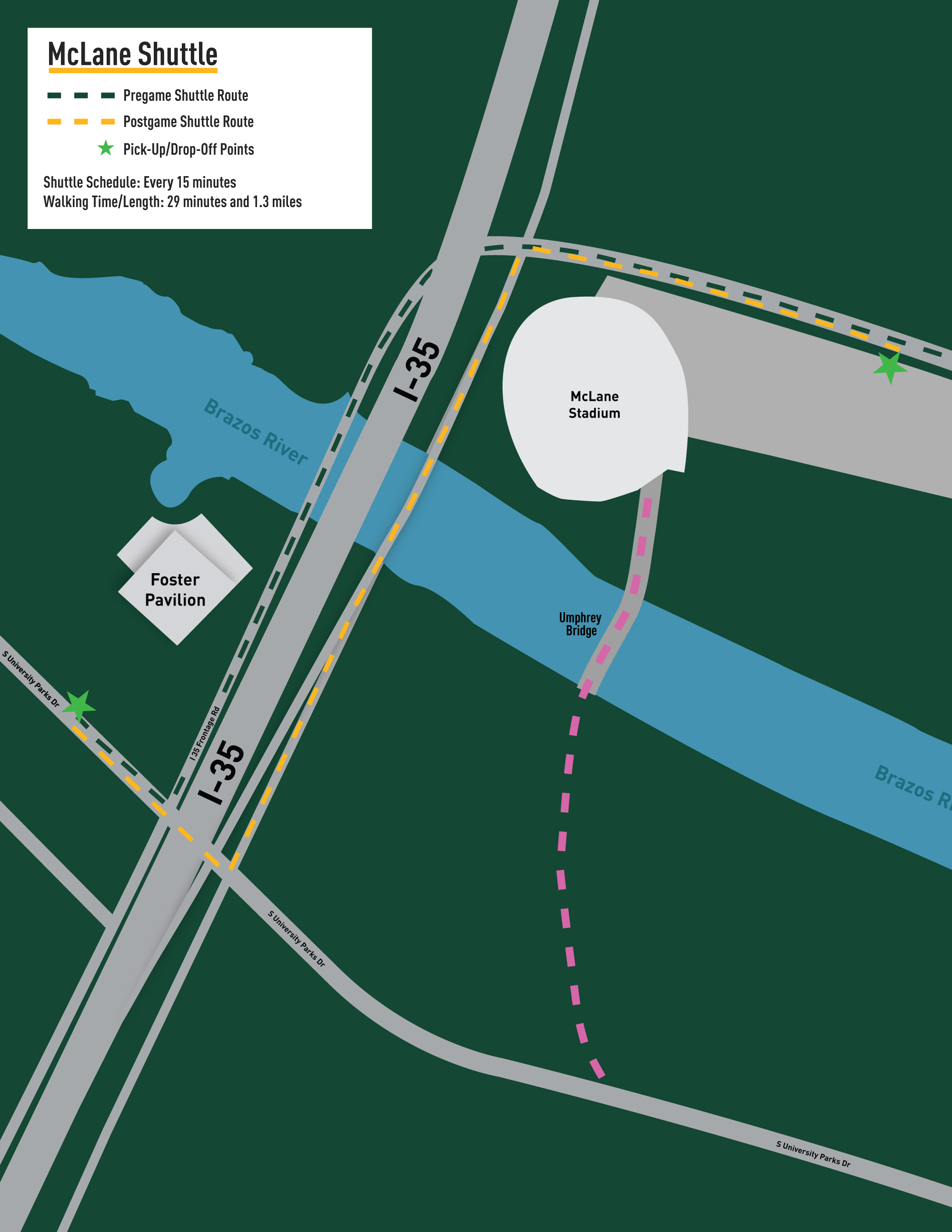 Baylor students and gameday operations staff can park at the Ferrell Center, where free, ADA-accessible shuttles will pick up on the south end of the parking lot near University Parks.