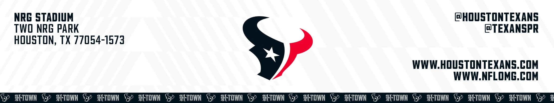 Media Site<https://www.nflomg.com/members/main/dashboard> | Team Site<https://www.houstontexans.com/> | @TexansPR<https://twitter.com/texanspr?lang=en> | @HoustonTexans<https://twitter.com/HoustonTexans?ref_src=twsrc%5Egoogle%7Ctwcamp%5Eserp%7Ctwgr%5Eauthor> | Schedule<https://www.houstontexans.com/schedule/> | Roster<https://www.houstontexans.com/team/players-roster/> | Videos<https://www.houstontexans.com/video/> | Photos<https://www.houstontexans.com/photos/>