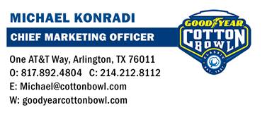 If you have any questions, please feel free to call Michael Konradi or David Waller at (817) 892-4800 or by e-mail at michael at cottonbowl.com<mailto:michael at cottonbowl.com>or david at cottonbowl.com<mailto:david at cottonbowl.com>.